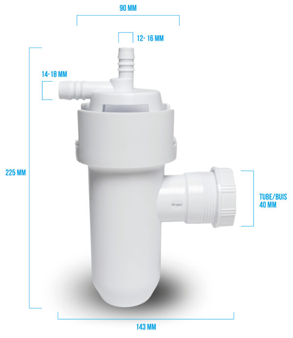 het leidingwater. - Luchtscheiding is voorzien van 2 tules (12mm tot 16mm en 14 tot 18mm) waardoor het mogelijk is om zowel afvoer als overloop samen aan te sluiten.